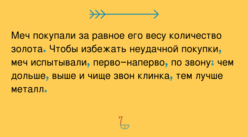 Меч покупали за равное его весу количество золота. Чтобы избежать неудачной покупки, меч испытывали, перво-наперво, по звону: чем дольше, выше и чище звон клинка, тем лучше металл. Также он должен был с легкостью и не тупясь, перерубить толстый гвоздь и разрезать брошенную на клинок ткань.