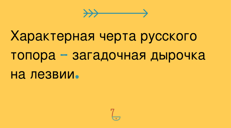 Характерная черта русского топора – загадочная дырочка на лезвии. Ученые выдвигал разные гипотезы – от того, что это – клеймо мастера до того, что туда вставлялся стержень, чтобы топор не глубоко застревал при ударе. На самом деле, все оказалось гораздо проще: за эту дырочку пристегивался кожаный чехол для безопасности транспортировки, а также за нее вешали топор к седлу или на стену.