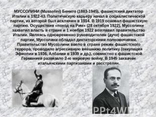 Биоргафия Бенито Муссолини (Mussolini)(1883-1945) - итальянский политический деятель, вождь (дуче)фашистской партии Италии, премьер-министр Италии (1922-1943).Политическую карьеру начал в социалистической партии, из которой был исключен в 1914 году. В 1919году основал фашистскую партию. Осуществи«поход на Рим» (28 октября1922), Муссолини захватил власть в стране и1 ноября 1922 возглавил правительство Италии. Являясь одновременно руководителем (дуче) фашистской партии, Муссолини обладал диктаторскими полномочиями. Правительство Муссолини ввело в стране режим фашистского террора, проводило агрессивную внешнюю политику (оккупация Эфиопии в 1936,Албании в 1939 и др.), совместно с фашистской Германией развязало 2-юмировую войну. В 1945 году был захвачен итальянскими партизанами и расстрелян