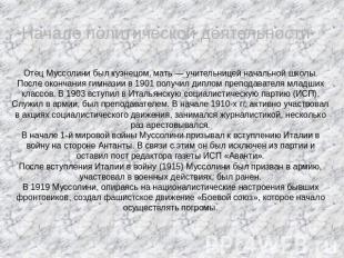 Начало политической карьеры В 1903 г Бенито вступил Итальянскую социалистическую партию (ИСП).Служил в армии, был преподавателем. В начале 1910-х годах он активно участвовал в акциях социалистического движения, занимался журналистикой, несколько раз арестовывался.