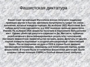 Фашистская диктатураФашистская организация Муссолини вскоре получила поддержку правящих кругов и быстро завоевала популярность среди тех слоев населения, которые жаждали порядка. На выборах 1921 Муссолини был избран депутатом парламента, а в 1922 назначен премьер-министром Италии. На выборах 1924 фашисты получили в парламенте большинство мест. Однако убийство депутата-социалиста Дж. Маттеоти, публично разоблачавшего фальсифицированные результаты голосования, поставило фашистское правительство на грань краха. Депутаты от других партий покинули парламент и создали оппозиционный «Авентинский блок». После покушения на дуче в 1926 в стране было введено чрезвычайное положение, запрещены все политические партии, кроме фашистской. В стране была установлена фашистская диктатура. Были созданы тайная полиция (ОВРА) и Особый фашистский трибунал.