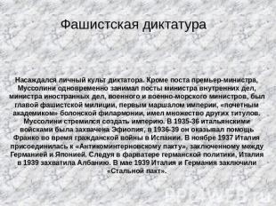 Насаждался личный культ диктатора. Кроме поста премьер-министра, Муссолини одновременно занимал посты министра внутренних дел, министра иностранных дел, военного и военно-морского министров, был главой фашистской милиции, первым маршалом империи, «почетным академиком» болонской филармонии, имел множество других титулов. Муссолини стремился создать империю. В 1935-36 гг. итальянскими войсками была захвачена Эфиопия, в 1936-39 гг. он оказывал помощь Франко во время гражданской войны в Испании. В ноябре 1937 г. Италия присоединилась к «Антикоминтерновскому пакту», заключенному между Германией и Японией. Следуя в фарватере германской политики, Италия в 1939 г. захватила Албанию. В мае 1939 г. Италия и Германия заключили «Стальной пакт». Фашистская диктатура