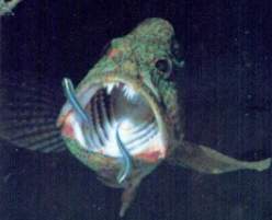 А оружие атаки — челюсти с множеством острых кривых зубов — предназначены для беспечных рыбок, приблизившихся к скорпене на расстояние ее стремительного, яростного броска. Весь вид скорпены говорит о ее опасности; и в то же время она красива — причем встречаются скорпены очень разной окраски — черные, серые, коричневые, малиново-желтые, розовые…