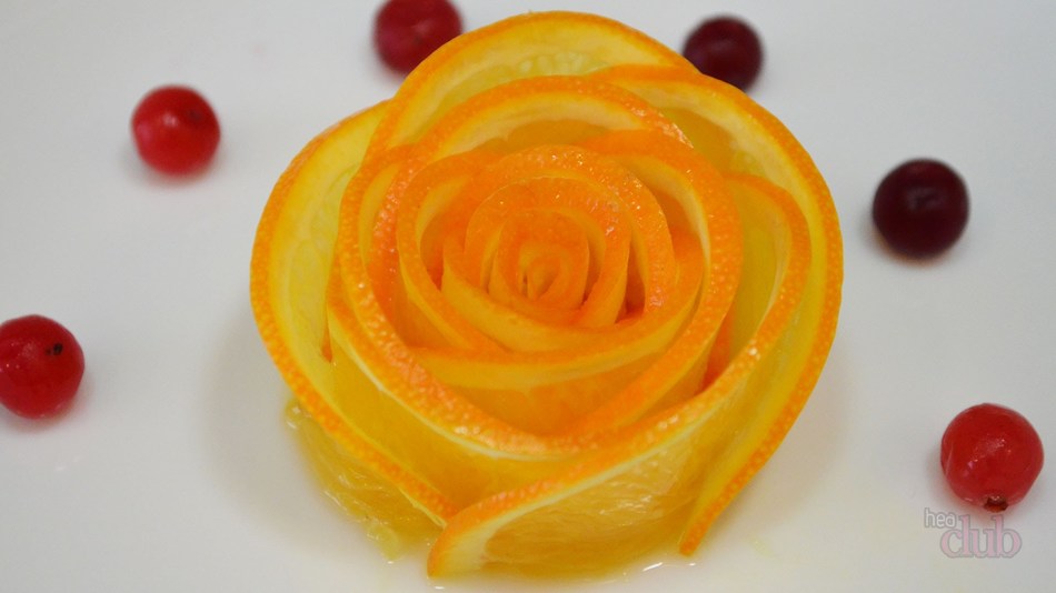 - Не обязательно очищать все плоды от кожуры. Она придаст нарезке контраст и дольше сохранит свежесть плодов. Кожуру можно использовать для украшения блюда. Например, из оранжевой цедры апельсина просто сделать оригинальную корзинку или изящный розовый бутон.