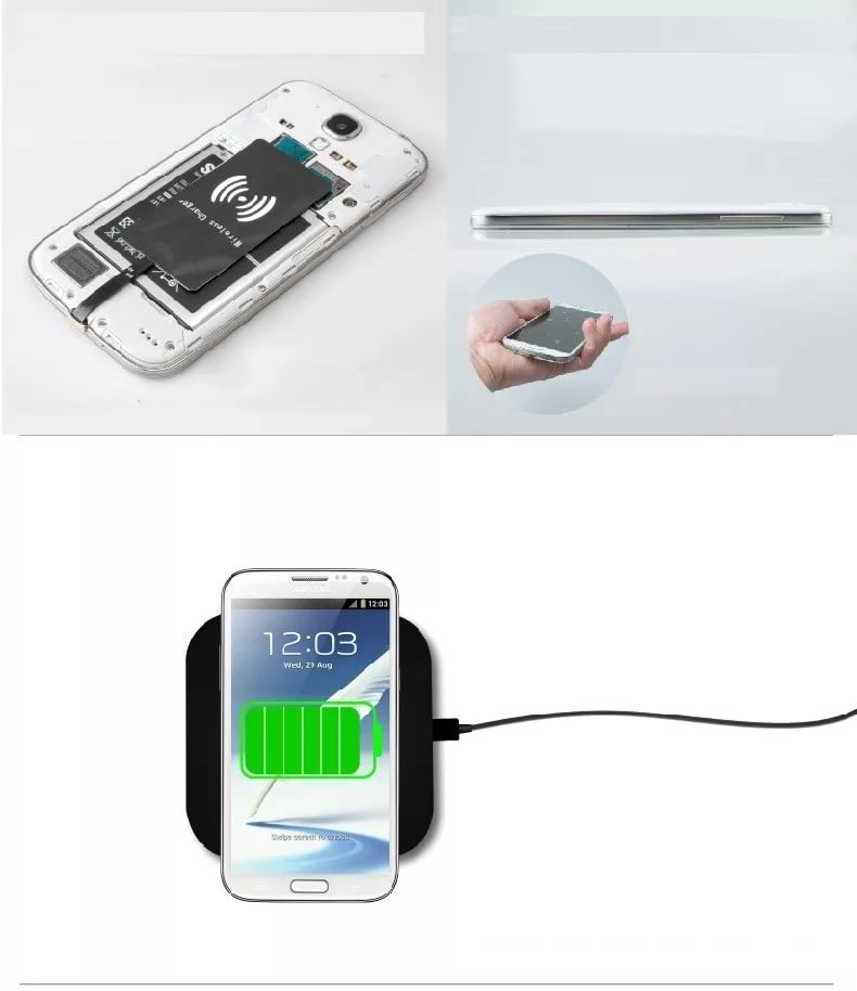 Выглядят они, как лист картона размером со спичечный коробок. Внутри этой пластинки размещена приемная катушка. Приемная часть бывает двух типов. Первый вариант – приемная часть размещается под крышкой аккумуляторного отсека смартфона и подключается прямо к аккумулятору.