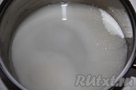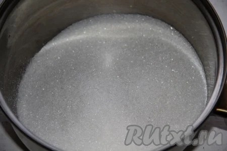 2 граненых стакана сахара высыпаем в кастрюльку, добавляем полстакана воды и ставим на сильный огонь.После закипания немного убавить жар и оставить кипеть сироп.Как только сироп начинает кипеть слабыми(ленивыми) пузырями,то он готов.