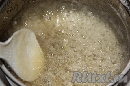 В казанке смешать сахар и воду. Варить на среднем огне наш сироп 2-4 минуты. Наша масса должна превратиться в золотистую карамель, но ни в коем случае не перевариться.