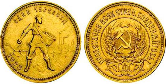 Золотой червонец содержал желтого металла 8,6 г и был аналогом десятирублевой николаевской монеты. К концу 1923 года он вытеснил все царские деньги и иностранную валюту.