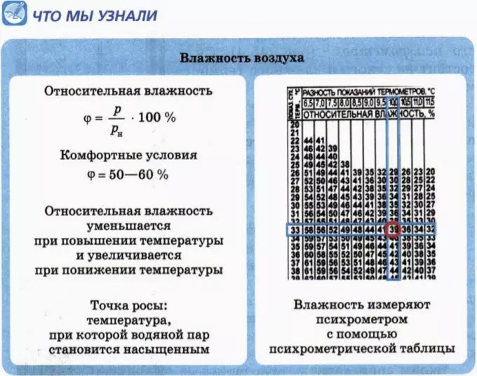 На сегодняшнем уроке мы познакомились с важной характеристикой воздуха - его влажностью. Как мы уже говорили, влажность в холодное время года (зимой) понижается, а в теплое (летом) повышается. Важно уметь регулировать эти явления, например при необходимости повысить влажность располагать в помещении в зимнее время несколько резервуаров с водой, чтобы усилить процессы испарения, однако такой способ будет эффективен только при соответствующей температуре, которая выше, чем на улице.