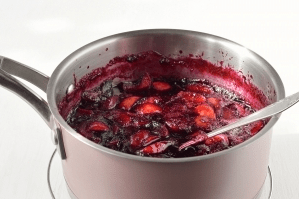 - Начните прогревать массу. Вскоре смородина начнет лопаться и пускать сок.