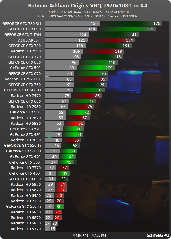 Наши видеокарты тестировались при разрешениях 1920х1080, 2560х1600 и 3840х2160 при максимальных настройках качества графики, допустимых Batman: Arkham Origins. Тесты проводились при различных режимах физики с сглаживания. Многочиповые конфигурации от AMD и NVIDIA показали неплохой прирост в быстродействии. Единственная проблема при работе SLI была обнаружена при максимальных настройках физики, где наблюдалось неравномерное падение производительности. Установка дополнительной видеокарты для ускорения физики решает эту проблему.