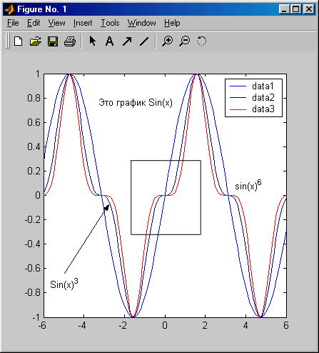 Итак, мы рассмотрели основные приемы форматирования графиков, в основном используя средства панели инструментов и отдельные, достаточно очевидные, команды из меню графического окна. Более подробно интерфейс пользователя графического окна будет описан в уроке 5.