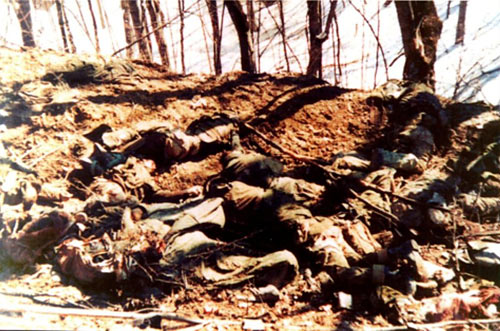На фото: Целые сутки после гибели 6-й роты федеральные войска не появлялись на высоте 776,0. Вплоть до утра 2 марта никто не обстреливал высоту, где хозяйничали боевики. Они не торопились: добили остававшихся в живых десантников, свалив их тела в кучу..