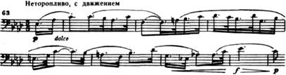 На приглушенных звучаниях pianissimo, в низких регистрах виолончелей и контрабасов звучит с-moll’ная тема-диалог. Почти речевая выразительность слышится в ее сумрачной, тревожной мелодии и в бессильно жалобных интонациях «ответа»: