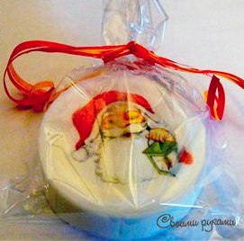 - оформление мыла в прозрачные мешочки с добавлением тематических украшений (цветов, шишек, декоративных снежинок)
