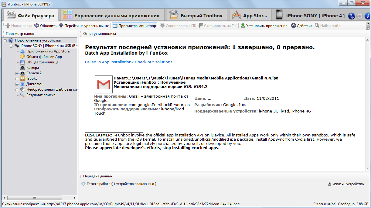 Обратите внимание, что разработчики iFunBox не рекомендуют загружать через свою программу приложения, вес которых превышает 1 Гб. Велик риск, что подобное приложение будет вылетать сразу после начальной заставки.