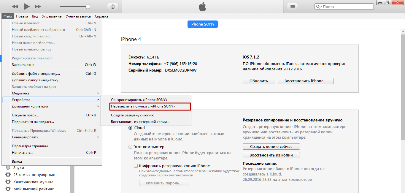 Шаг 2 . Отыщите раздел «Устройства » и кликните на пункт «Переместить покупки с iPhone » в открывшемся меню.
