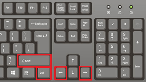 - Ctrl +«стрелка (влево, вправо)» – Переставляет курсор в тексте либо на начало текущего слова (при стрелке влево), либо на начало следующего слова в тексте (при нажатии стрелки вправо). Если при этой команде также удерживать клавишу Shift , то будет происходить не перемещение курсора, а выделение слов справа или слева от него в зависимости от стрелки;