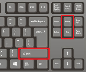 - Строки вверх выделяются с помощью нажатия клавиши Home, а после Shift+Стрелка Вверх, вниз - с помощью нажатия клавиши End+Shift+Стрелка Вниз. Удерживайте данное сочетание клавиш, пока не выделится необходимое количество строк.