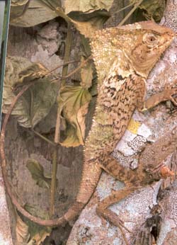 Совсем небольшое семейство Corytophanidae не может остаться незамеченным, поскольку один из трех входящих в него родов – василиски (Basiliscus ). Это просто фантастические крупные древесные ящерицы с большим шлемовидным выростом на затылке и высоким гребнем на спине и хвосте. Этот гребень поддерживается специальными выростами позвонков. Василиск знаменит не только необычным обликом, но и уникальной способностью бегать на задних лапах, причем не только по суше, но и по поверхности воды! Помимо этого он прекрасно плавает и лазает по деревьям.