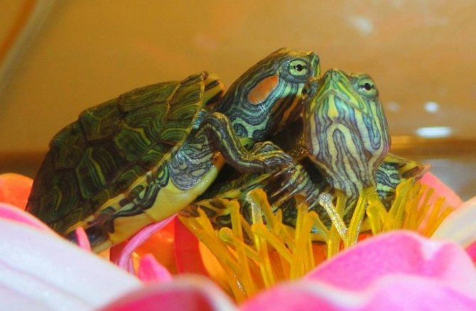 Период развития детенышей внутри яйца составляет 2-5 месяцев. Все это время необходимо поддерживать установленные температурные показатели. Как только черепашки появятся на свет, поместите их в отдельный аквариум, где они будут содержаться в течение года.