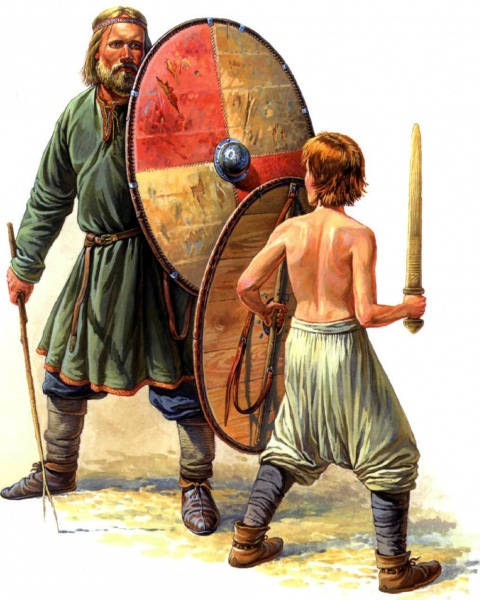 Стоит сказать пару слов и о применении меча в бою. Родился меч как оружие чисто наступательное: воины прорубали мечами себе дорогу к цели. Причем заметьте: именно прорубали, ведь меч чисто рубящее оружие. Часто даже конец меча делали закругленным. Кололи им, как шпагой в экстренных случаях: или когда воин доходил до состояния аффекта (становился «берсеркером») или когда уколоть врага – единственная возможность его уязвить (как, например, защищенного панцирем рыцаря-крестоносца). Вообще, меч, разрабатываясь как чисто наступательное оружие, не предполагал функций защиты, поэтому на первых порах у него не было даже «огнива»-перекрестия на рукояти: мечом удары не парировали. Ввиду этого, в VII-X веках у меча развивается это самое перекрестие, или как называли его на Руси, «огниво», а с мечом неразрывно сопутствует щит.
