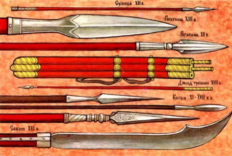Копье – излюбленное оружие русских ратников и ополченцев – представляло собой насаженный на длинное, 180-220 см, древко, изготовленное из прочной древесины, стальной (булатный) или железный наконечник. Вес наконечника составлял 200-400 граммов, длина – до полуметра. Наконечники домонгольской Руси разделили примерно на семь типов, по форме рабочей части. Древко («древо», «стружие», «оскепище») делалось из таких пород дерева, как береза, дуб, ясень, клен. Диаметром оно было 2,5-3,5 см. Иногда древко оковывалось металлом, чтобы враг не перерубил его. Сверху на него насаживали наконечник со втулкой (куда и вставлялось древко). Наконечники достигали в длину полуметра. Были случаи использования целых «мечей» на палке, могущих не только колоть, но и неплохо рубить. Формы наконечников были разнообразны, но все же преобладали удлиненно-треугольные наконечники. Толщина наконечника доходила до 1 см, а ширина – до пяти см. Оба режущих края при этом затачивались. Изготовлялись как цельностальные наконечники, так и составные: на стальную полосу в центре накладывались две железные пластины – такой наконечник получался самозатачивающимся.