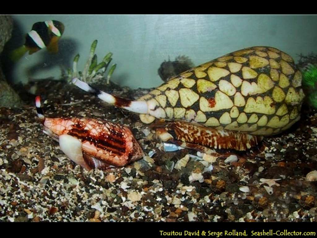 Географический конус (Conus geographus) с вытянутым ловчим хоботком, по бокам от которого видны стебельки с глазами. На подошве моллюска рисунок такой же, как и на раковине.