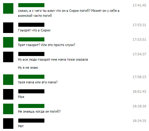 Человек на скриншотах выше — друг погибшего, не самый близкий, судя по тому, что в последний раз с ним общался летом 2014-го года. Зелёным цветом на сообщениях закрашены мы, чёрным — друг погибшего. Дальше мы пообщались с другим другом погибшего. Мы установили отчество погибшего (Владимирович), подтвердили его возраст (27 лет), подтвердили существование брата Александра, а также жены и дочери. Кроме того, второй друг также подтвердил, что Фёдор погиб в Сирии: