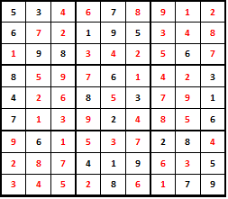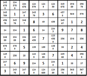 Если вы усвоили урок того, как играть в судоку, и шаг за шагом выполняли вышеперечисленные указания, то у вас должна получиться примерно такая картина, как на этом поле: