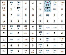 Понятие «голая пара» присутствует только в игре судоку. Правила их обнаружения следующие: если в двух ячейках одного блока, строки или столбца присутствует идентичная пара кандидатов (и только эта пара!), то остальные ячейки группы их иметь не могут. Объясним это на примере восьмого блока. Проставив в каждую клетку возможных кандидатов, обнаруживаем явную «голую пару». Цифры 1 и 3 присутствуют во второй и пятой ячейках этого блока, и там и там присутствует всего лишь по 2 кандидата, следовательно, из остальных ячеек их можно смело исключать.