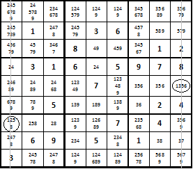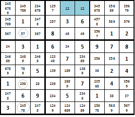 - Просматривая также строки и квадраты, исключайте цифры, которые повторяются.