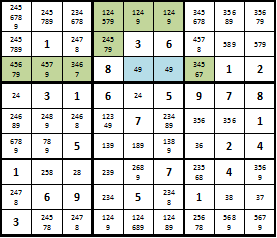 Из выделенных зеленым ячеек можно удалить значения синих и тем самым сократить количество вариантов. При этом располагающаяся в первой строке комбинация 1249 называется по аналогии «открытой четверкой». Также можно встретить «открытые тройки». Такие действия влекут за собой появление других открытых пар, например 1 и 2 в верхней строке, которые также дают возможность сузить круг комбинаций. Параллельно проставляем в обведенной ячейке первого квадрата 7, так как пятерка в данной строке в любом случае будет располагаться в нижнем блоке.