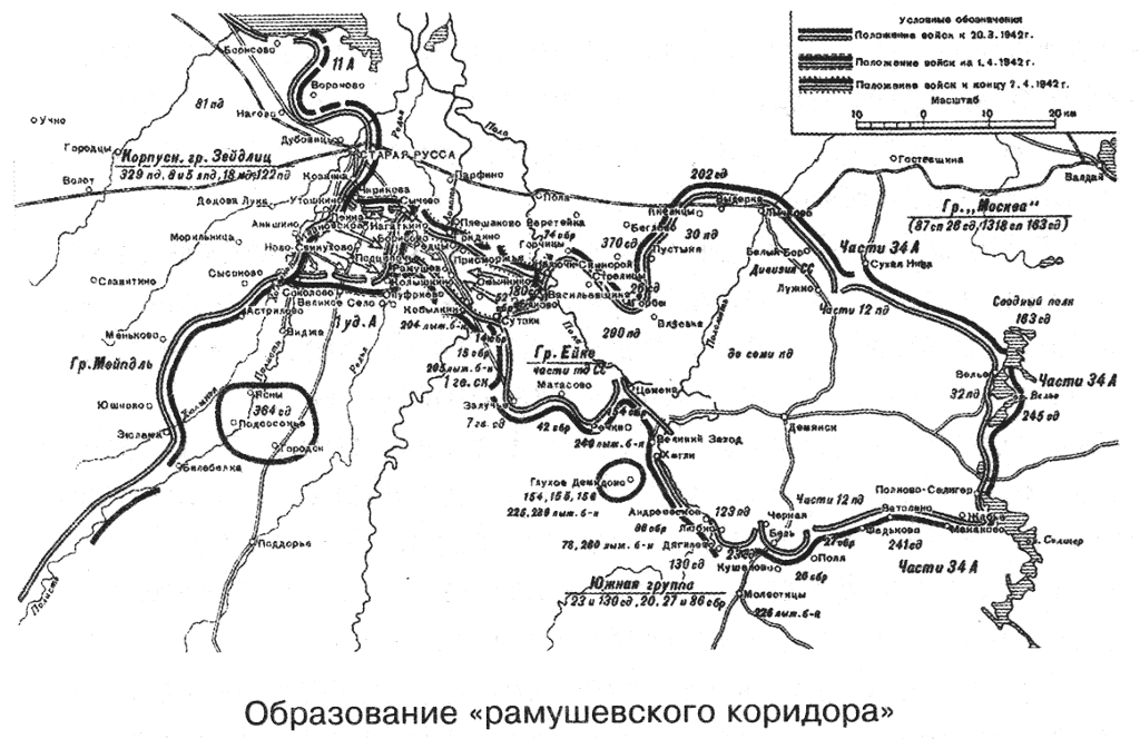 Дивизии 2-го немецкого корпуса стояли твердо. Однако 8 февраля 1942 года их окружили, и впоследствии им пришлось получать снабжение по воздуху. В конце апреля 1942 года атакой снаружи и контратакой изнутри мешка была восстановлена связь с основным немецким рубежом на реке Ловать. Построенные мосты снова восстановили коридор между основным немецким фронтом 16-й армии от Старой Руссы до Холма и дивизиями в районе Демянска. Конечно, этот коридор, ведущий в демянскую боевую зону, был опасно узок, но 2-й армейский корпус удерживал его. Он преграждал русским сухопутную дорогу между озерами Ильмень и Селигер, сковывая пять советских армий. Однако весь 1942 год существовала постоянная угроза, что советские части смогут отрезать демянский "гриб" у его основания, много месяцев 100-тысячный немецкий войсковой контингент находился на грани катастрофы.