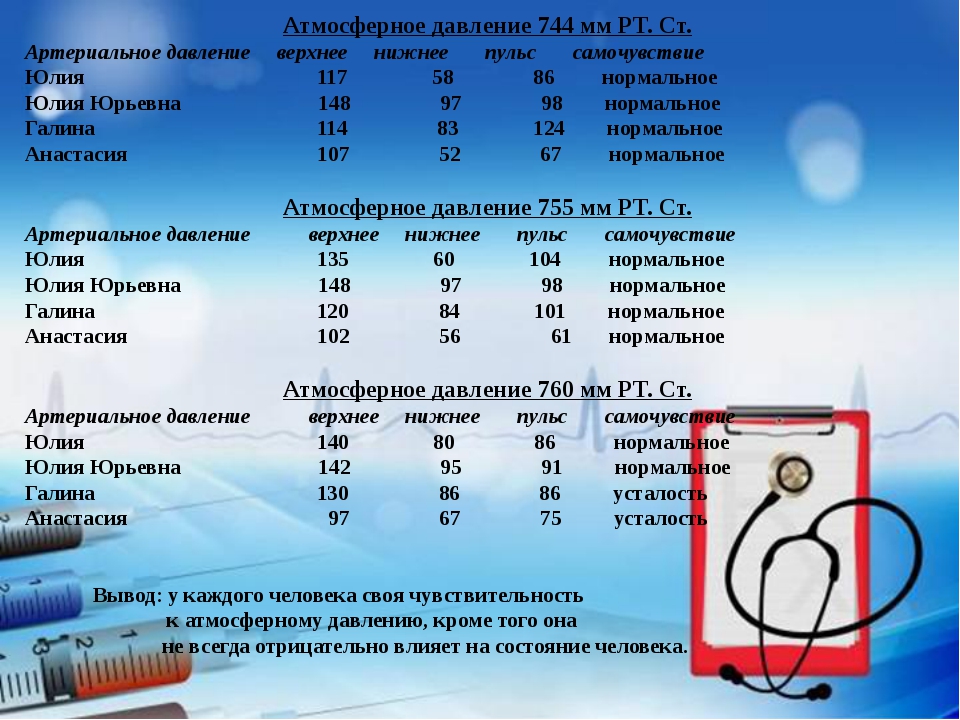 Если же атмосферное давление выше или ниже нормы, некоторые люди (особенно пожилые или больные) чувствуют недомогание, головную боль, отмечают обострение хронических болезней.