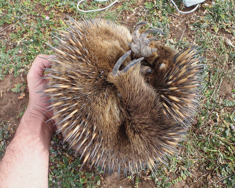 Пойманная самка ехидны приняла защитную позу. В центре живота видно крошечное яйцо, отложенное ею в выводковую сумку.