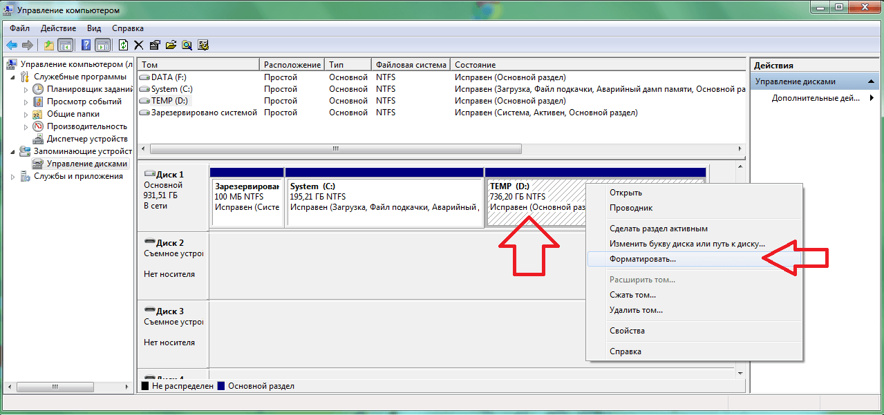 Альтернативный способ отформатировать HDD штатными средствами — через «Панель управления». Для этого нужно найти меню «Администрирование», выбрать в нем «Управление компьютером» и в левой колонке найти «Управление дисками. В открывшемся меню отобразятся все накопители в виде структуры. Плюс способа состоит в том, что так можно форматировать диски, на которых нет раздела и потому они не отображаются в «Проводнике».