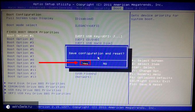 3 Через БИОС (BIOS) проверить, что система загружается сначала с флешки, нажать кнопку F10, согласиться.