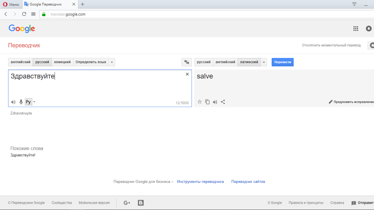 Известный в своем роде инструмент для перевода текстов и отдельных слов . Совсем недавно добавил в перечень 100 языков для перевода и латынь. Бесплатный переводчик мгновенно трансформирует слова с русского на латинский язык и обратно. Готовый текст открывается в отдельном поле. Google Translate – самый эффективных онлайн-переводчик, с удобным интерфейсом и достоверным переводом текста, если нет ошибок в исходных словах.