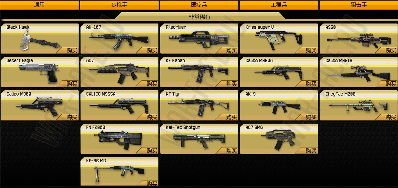У игрока нет возможности определить какое оружие он будет открывать - после того, как одно оружие открыто, случайным образом предоставляется новое оружия для разблокировки из той категории, которая в данный момент "раскрывается" бойцом. Каждая категория имеет пять типов вооружения - вспомогательное (пистолеты, холодное оружие), штурмовые винтовки и пулеметы (штурмовик), дробовики (медик), автоматы и пистолет-пулеметы (инженер), снайперские винтовки (снайпер).