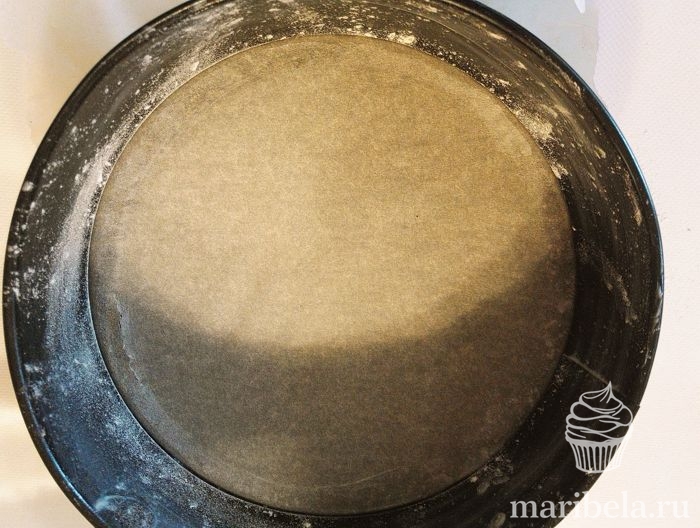 - Форму смазать сливочным маслом и обсыпать мукой, либо застелить пергаментом.
