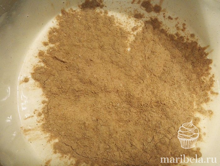 - Смешать 200 г муки с 3,5 ст. л. какао и 2 ч. л. разрыхлителя.