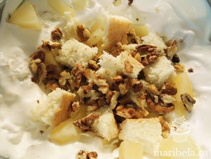 Данный вариант приготовления десерта вместо консервированных фруктов предполагает добавление изюма и орехов.