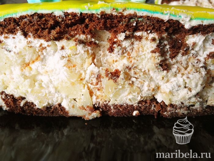 В этом десерте идеально сочетаются легкий бисквит, нежный крем, кусочки сладкого ананаса и шоколадная глазурь.