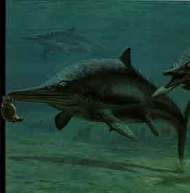 Первые ихтиозавры появились еще в триасе. Эти рептилии идеально приспособились к жизни в неглубоких морях юрского периода. Они обладали обтекаемым туловищем, плавниками разной величины и длинными узкими челюстями. Крупнейшие из них достигали в длину примерно 8 м, однако многие виды по размеру не превышали человека. Это были великолепные пловцы, питавшиеся главным образом рыбой, кальмарами и наутилоидеями. Хотя ихтиозавры относились к рептилиям, по их ископаемым останкам можно предположить, что они были живородящими, то есть производили на свет готовое потомство, как млекопитающие. Возможно, детеныши ихтиозавров рождались в открытом море, подобно китам.
