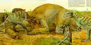 завров - так называемых гадрозавров. Это были "газели" мира динозавров. Они щипали низкорослую растительность своими роговыми клювами, а затем пережевывали ее крепкими коренными зубами.