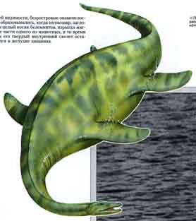 Другая группа хищных рептилий, также широко распространенная в юрских морях, - плезиозавры. Их длинношеие разновидности обитали у поверхности моря. Здесь они охотились за косяками нсоольших рыб при помощи своих гибких шей. Короткошеие виды, так называемые плиозавры, предпочитали жизнь па больших глубинах. Они питались аммонитами и прочими моллюсками. Некоторые крупные плиозавры, по всей видимости, охотились также па менее крупных плезиозавров и ихтиозавров.