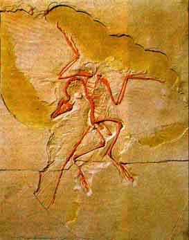 Одним из ископаемых существ, сочетающих признаки птиц и рептилий, является археоптерикс, или первоптица. Впервые его скелет обнаружили в так называемых литографских сланцах в Германии. Находка была сделана через два года после выхода труда Чарльза Дарвина «Происхождение видов» и стала веским аргументом в пользу теории эволюции. Летал археоптерикс ещё довольно плохо (планировал с дерева на дерево), а размером был примерно с ворону. Вместо клюва он имел пару зубастых, хотя и слабых челюстей. На крыльях его были свободные пальцы (из современных птиц они сохранились лишь у птенцов гоацинов).