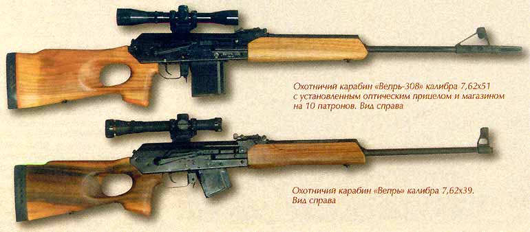 Нарезной карабин «Вепрь» калибра 7,62 мм, рассчитанный на использование патронов.308 Win. По мощности он лишь незначительно уступает карабину «Тигр», с которым применяются боеприпасы 7,62×54. Начальная скорость пули – 830 м/с.