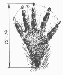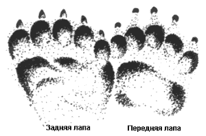 Отпечаток передней лапы имеет значительные отличия от задней. Первый имеет округлую форму, с ясно видимыми большими когтями.